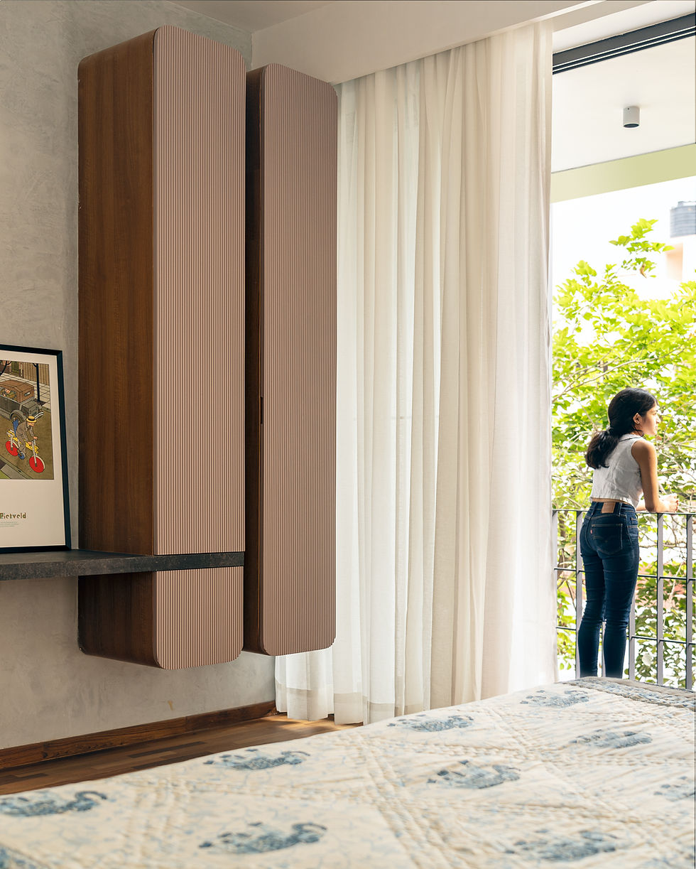 The façade of the home was designed with a jali screen made of hollow terracotta blocks. The porosity of the screen allowed for ample light to flow into the home and a buffer space with greenery served as balconies providing ample transition to the living and bedrooms within.